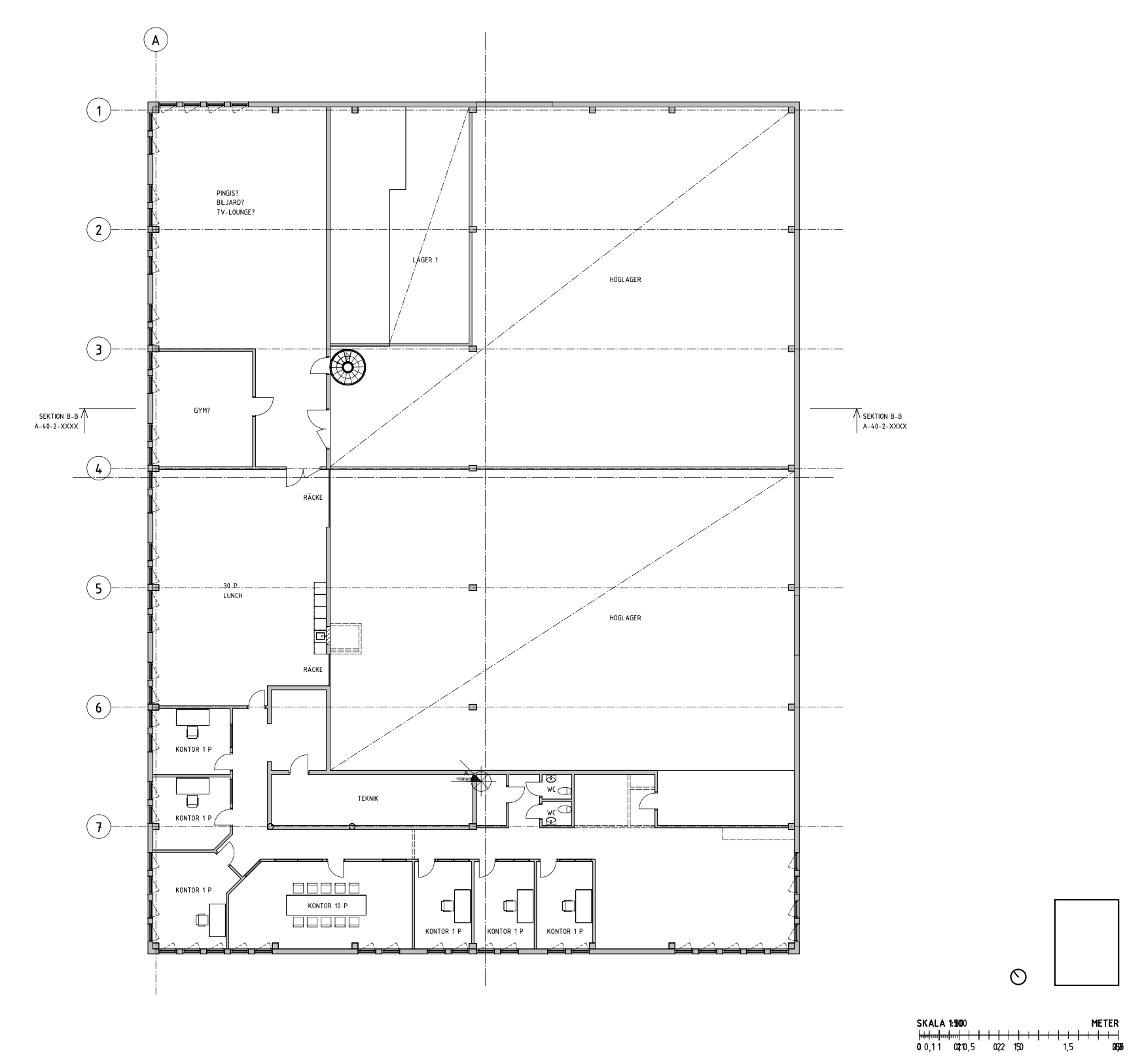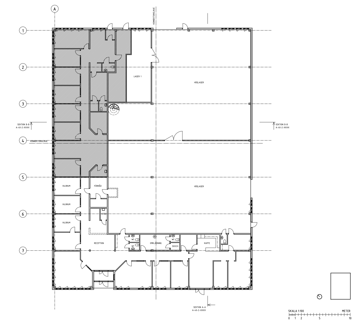 Pelarbyggd fastighet med mellanväggar som kan anpassas efter ny hyresgästs önskemål. Totalrenovering av inre ytskikt är under planering för färdigställande 2026.